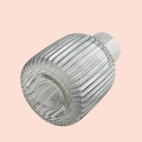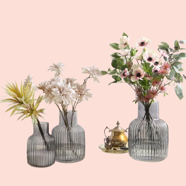 Nordic simple relief glass vase features transparent design, compact size, and elegant relief pattern. Ideal for modern home decor, flower arrangements, and table centerpieces.